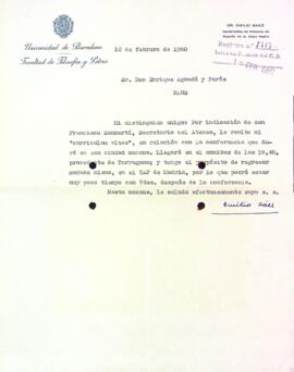 Emilio Saez, catedràtic a la Facultat de Filosofia i Lletres de la Universitat de Barcelona, envia el seu curriculum vitae al Centre de Lectura per a la conferència que celebrarà a l'entitat. Data del document: 12-02-1960