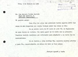 Enric Aguadé comunica a Antonio Palmés l'enviament d'una còpia del reglament del Centre de Lectura tal com havia sol·licitat.