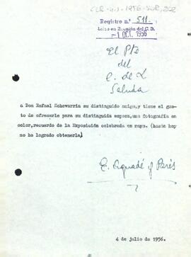 Enric Aguadé comunica a Rafael Echevarría el donatiu d'una fotografia de l'exposició per a la seva esposa.