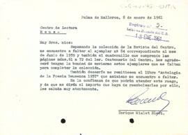 Enric Mialet sol·licita l'enviament d'uns numeros de la Revista del centre de Lectura.