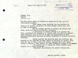 Enric Aguadé informa a l'empresa Inmade d'haver rebut part del mobiliari i els posa al dia de les novetats de les reformes. Data del document: 02-05-1964
