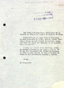 Enric Aguadé firma el certificat de treball de Rosa Mont perquè consti que va fer de professora de música al Centre de Lectura. Data del document: 30-01-1964