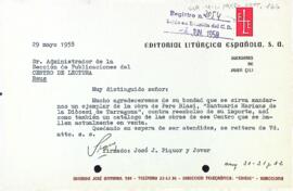 José Piquer, de l'Editorial Litúrgica Española, sol·licita el llibre "Santuaris Marians de la Diòcesi de Tarragona" així com un catàleg amb la resta de publicacions de l'entitat. Data del document: 29-05-1958
