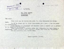 El president Aguadé confirma la data de la conferència sobre el Sant Greal a Catalunya de Joan Amades, a la qual podrà assistir. Data del document: 14-10-1955