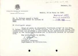 La Dirección General de Información envia els currículums dels següents conferenciats que assistiran al Centre de Lectura. Data del document: 26-03-1958