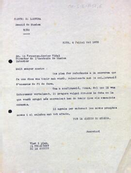 La Secció de Música pregunta al director de l'Acadèmia de música del Centre de Lectura, Francesc Xavier Vidal, en quina data vol fer l'examen. Data del document: 04-07-1958