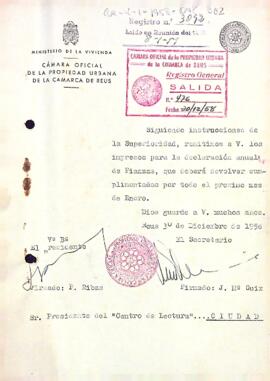 La Cámara Oficial de la Propiedad Urbana de la Comarca de Reus envia els impresos fer la declaració anual de finances del Centre de Lectura. Data del document: 30-12-1958