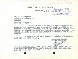 La secció comercial de l'Editorial Selecta demana una carta de confirmació sobre si l'entitat a rebut o no els llibres que van enviar. Data del document: 08-05-1958