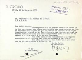 El Círculo de Reus es mostra conforme en que les representacions del Teatre Català Modern es facin al Teatre Fortuny. Data del document: 26-03-1958
