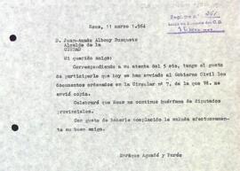 Enric Aguadé informa a Joan-Amado Albouy que ha enviat al govern civil els documents de la circular n. 7 . Data del document: 11-03-1964