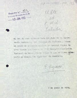 El president Aguadé envia el darrer número de la Revista del Centre de Lectura a Juan Antonio Lara, en el qual es ressenya el VIII Concurs-Exposició de Roses. Data del document: 06-06-1955