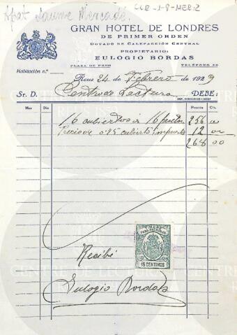 Factura enviada pel Gran Hotel de Londres amb el cost total del sopar que es va oferir per homenatjar a Jaume Mercadé.