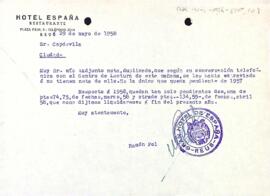 El Gran Hotel d'España de Reus envia la factura que el Centre de Lectura havia perdut. Data del document: 29-05-1958