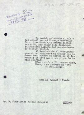 El president Aguadé felicita a Joan-Amado per haver obtingut el càrrec de tinent d'alcalde de Reus. Data del document: 11-02-1955