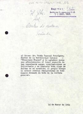 Enric Aguadé felicita a Tomás Pascual pel seu càrrec com a rector de la Universitat Laboral "Francisco Franco". Data del document: 14-03-1964