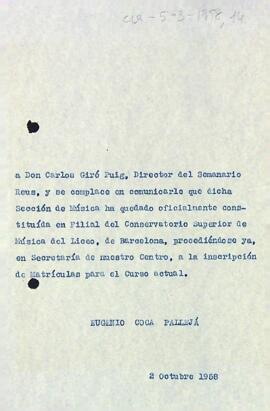 La Secció de Música comunica a Carles Giró, director del Setmanari Reus, que la Secció de Música ja és oficialment una filial reconeguda del Conservatori de Música del Liceu. Data del document: 02-10-1958