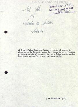 Enric Aguadé envia a Ernesto Nabás el full d'actes en el qual apareix la seva conferència. Data del document: 07-03-1964