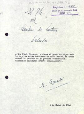 Enric Aguadé envia a Pablo Navarro el full d'actes en el qual apareix la seva conferència. Data del document: 06-03-1964