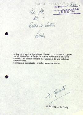 Enric Aguadé envia a Alexandre Sanvisens el full d'actes en el qual apareix la seva conferència. Data del document: 06-03-1964