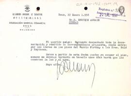 La Delegació Sindical Comarcal de Reus informa que ja s'han entregat les claus dels pisos del Barri Fortuny als senyors Solé i Espinosa. Data del document: 22-01-1958