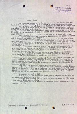 Enric Aguadé Parés envia una instància al Ministre d'Educació Nacional demanant declarar el Centre de Lectura com a centre d'instrucció a efectes tributaris. Data del document: 22-02-1957