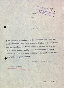 Model d'invitació, enviada a diverses persones, a la conferència de Jesús Tharrats Vidal. Data del document: 04-04-1957