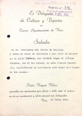 L'alcalde de Reus convida al president Aguadé a assistir a la inauguració de l'exposició en homenatge del pintor Llovera. Data del document: 25-06-1958