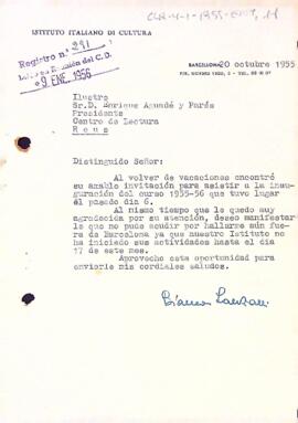 Bianca Lanzanni lamenta no haver pogut assistir a la inauguració del curs 1955-56 del Centre de Lectura. Data del document: 20-10-1955