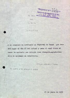 Invitació al festival de Dansa del Centre de Lectura, enviada a la premsa i Ràdio. Data del document: 15-06-1957