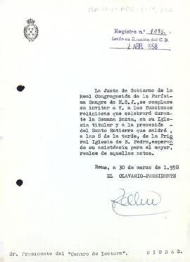 La Reial Congregació de la Puríssima Sang convida al president Aguadé als actes organitzats per Setmana Santa. Data del document: 30-03-1958