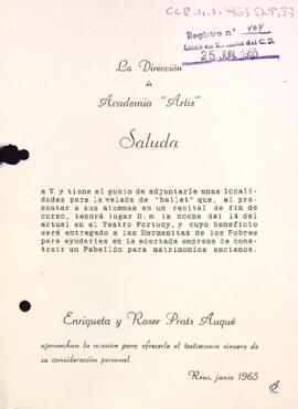 La direcció de l'Acadèmia Artis convida a la vetllada del ballet al Teatre Fortuny el benefici de la qual serà entregat a les Germanetes dels pobres.