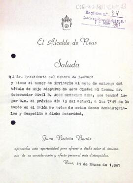 Invitació de l'alcalde de Reus al president del Centre de Lectura