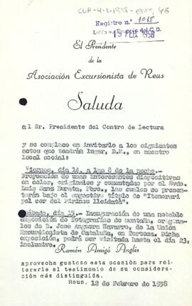 L'Associació Excursionista de Reus convida al president Aguadé als propers actes organitzats: projecció d'una diapositives del Pirineu Lleidatà i inauguració d'una exposició de fotografies de la Unió Excursionista de Catalunya a Tortosa. Data del document: 12-02-1958