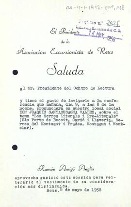 L'Associació Excursionista de Reus convida al president Aguadé a la conferència de Joaquim Santasusagna. Data del document: 08-05-1958