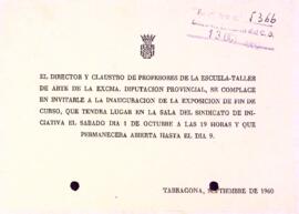 L'Escola Taller d'Art de Tarragona convida al Centre de Lectura a l'exposició de final de curs. Data del document: Setembre de 1960