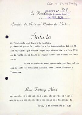 Invitació de Lluís Fortuny al president del Centre de Lectura