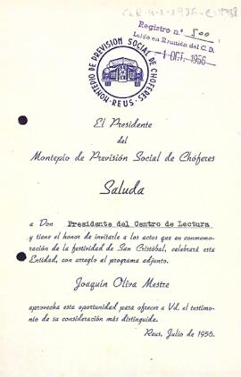 Invitació de Montepío de Previsión Social de Chóferes al president del Centre de Lectura