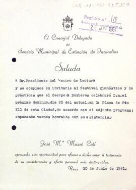 Josep M. Massó convida Enric Aguadé al festival gimnàstic i de pràctiques del cos de Bombers.