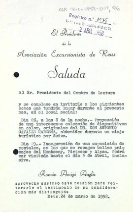 La Secció Excursionista convida al president Aguadé als propers actes que organitzen: projecció de diapositives i inauguració d'una exposició de postals. Data del document: 24-03-1958