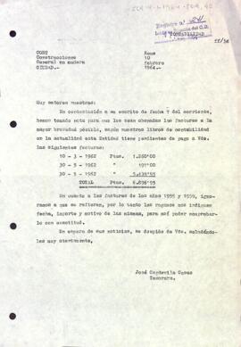 Josep Capdevila informa que s'ha donat l'ordre de pagament de les factures pendents de l'empresa de construccions CORT. Data del document: 10-02-1964