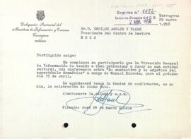 La Delegació Provincial d'Informació i Turisme patrocinarà la xerrada de Manuel Dicenta. Data del document: 29-03-1958