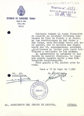 La Sociedad de Cazadores Diana demana un trofeu pel concurs que tir que han organitzat. Data del document: 12-05-1958