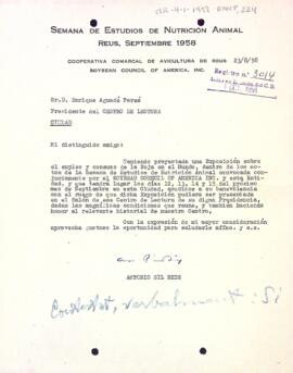Antoni Reig demana poder utilitzar les sales del Centre de Lectura per la presentació de l'exposició en motiu de la setmana d'estudis de nutrició animal. Data del document: 23-08-1958