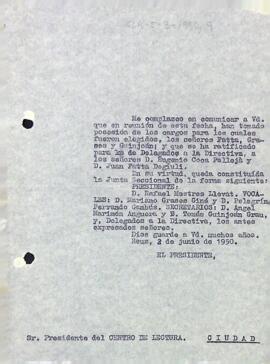 La Secció de Música informa que els senyors escollits en les darreres eleccions ja han pres possessió dels nous càrrecs, queda així constituïda la nova junta de la secció de música. Data del document: 02-06-1950