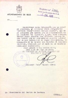 L'ajuntament de Reus demana al Centre de Lectura que participi amb el Concurs de Fotografia oferint un premi. Data del document: 29-05-1958