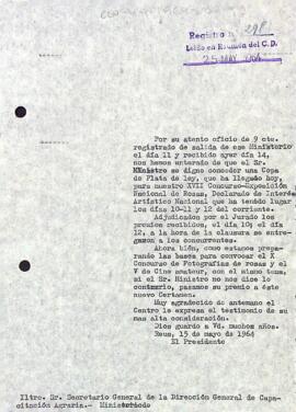 Enric Aguadé comunica a la Direcció General de Capacitació Agrària que el premi que van enviar pel Concurs Exposició de Roses no va arribar a temps, però que si els sembla bé el poden aprofitar pel Concurs de Fotografies de Roses o pel de Cinema Amateur. Data del document: 15-05-1964