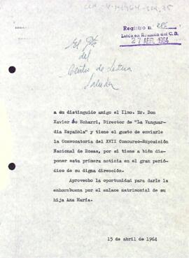 Enric Aguadé envia al director de La Vanguàrdia la convocatòria de la XVII Concurs Exposició de roses perquè en faci difusió al seu diari. Data del document: 15-04-1964