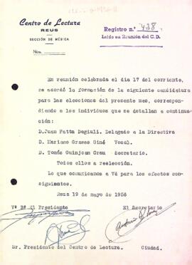 Proposta de candidatura a les eleccions de 1956 de la Secció de Música. Data del document: 19-05-1956