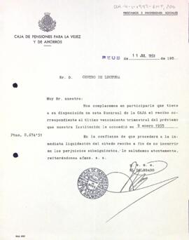 La Caja de Pensiones para la Vejez y de Ahorros informa que ja es pot recollir el rebut del darrer venciment de trimestre del préstec a nom de l'entitat. Data del document: 11-07-1958