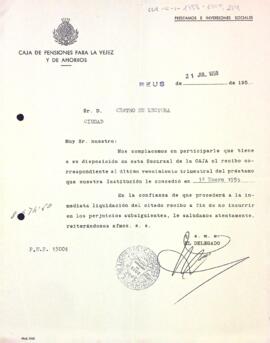 La Caja de Pensiones para la Vejez y de Ahorros informa que ja es pot recollir el rebut del darrer venciment de trimestre del préstec a nom de l'entitat. Data del document: 21-07-1958
